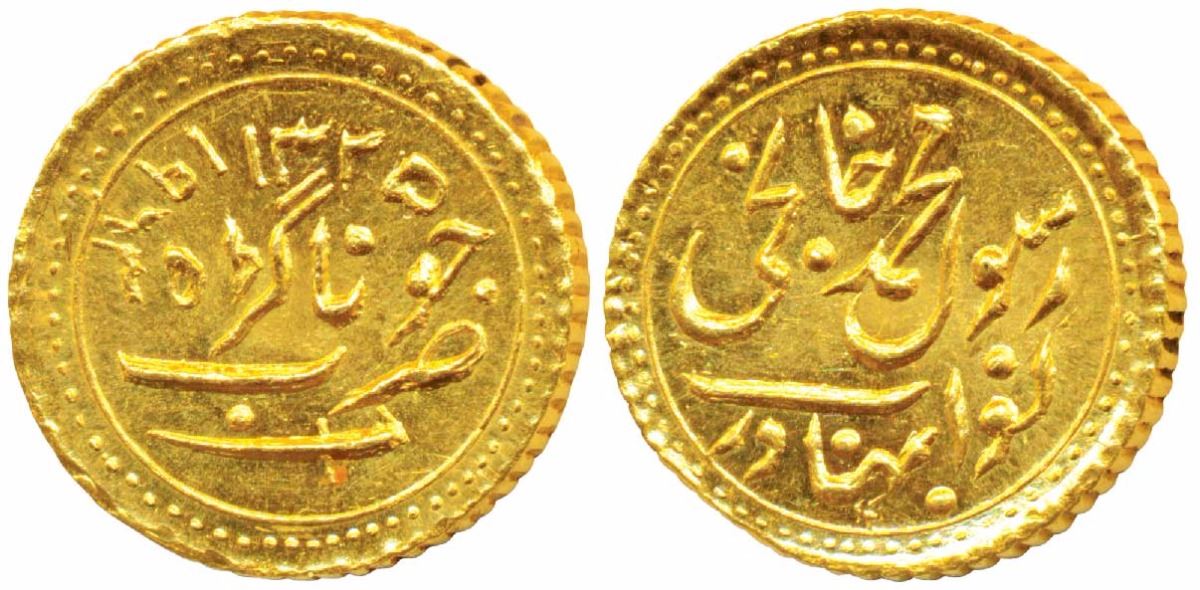 Rasul Muhammad Khan (AH 1309-1329, VS 1948-1968, 1891-1911 AD), Presentation issue, Gold Mohur, 11.5g, Junagadh / Junagarh Mint, obv. Nawab Bahadur Rasul Muhammad Khanji, rev. Zarb Junagadh (AH) 1325, (VS) 1963, a sword at bottom, legend on both sides within dotted border and circle, reeded edge (KM 60, Friedberg 1247). Superb mint lustre, Superb Mint State, Extremely Rare. Gold Koris of Junagadh are very rare and seldom seen. This specimen is a mohur, and is the only coin of this type that has been offered for sale.