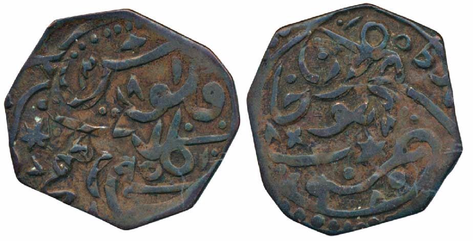 Khudadad Khan (AH 1274-1311, 1856-1893 AD), Octagonal Copper Falus, 4.17g, Kalat Mint, in the name of Mahmud Khan Durrani, Error, double struck on both side (KM 21). Very Fine+.