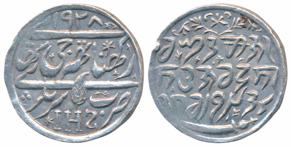Ranbir Singh, Silver Rupee, 7g, Srinagar Mint, VS 1928, IHS instead of the usual JHS and the alphabet S inverted, hence unlisted in KM. Broad flan, Extremely Fine.