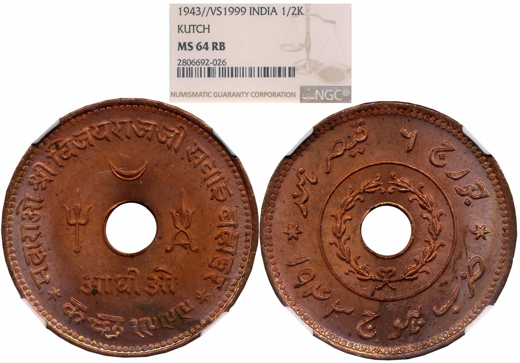 Rao Sri Vijayrajji, Copper Adhiyo, VS 1999/ AD 1943, with the name of George VI (KM# Y# 80, RS# 267.1). Slabed & Graded by NGC as MS 64 RB, very rare in such high grade.