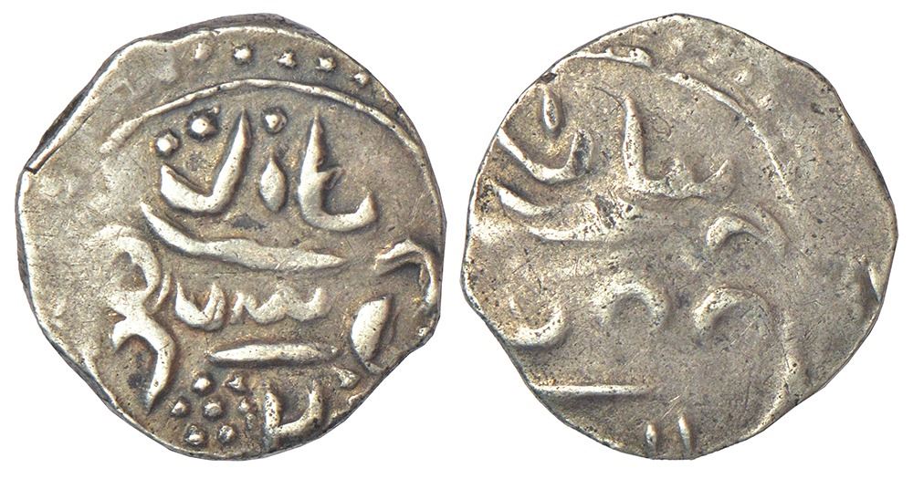 Ladakh, silver Ja'u copying design of Garhwali tamisha coin struck between 1780-1800 AD, dated 2x on obverse, similar to KM 1.2, 2.56g.