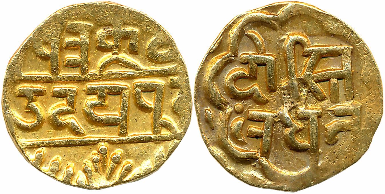 Swarupshahi, Gold 1/4 Mohur, 2.66g, Obv: Devnagari Legend Chitrakut /Udaipur, Rev: Dosti/ London (KM# Y#A12). Minor scratch mark in centre of rev, otherwise almost uncirculated, rare.