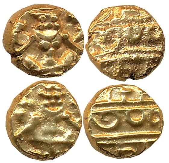 Krishna Raja Wodeyar, Gold Narsimha Fanam (2), 0.39g, 0.38g, Obv: Lord Narsimha, Rev: Legend (KM# C# 212). Very fine. 2 coins.