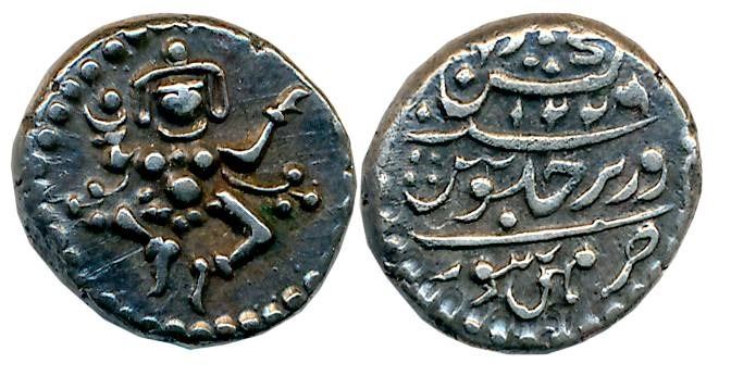 Krishna Raja Wodeyar, Silver 1/4 Rupee- Pavali, 2.84g, Mahisur Mint, AH 1226, in the name of Shah Alam II, dancing figure of Chamundi on obverse (KM# C# 202). About extremely fine.