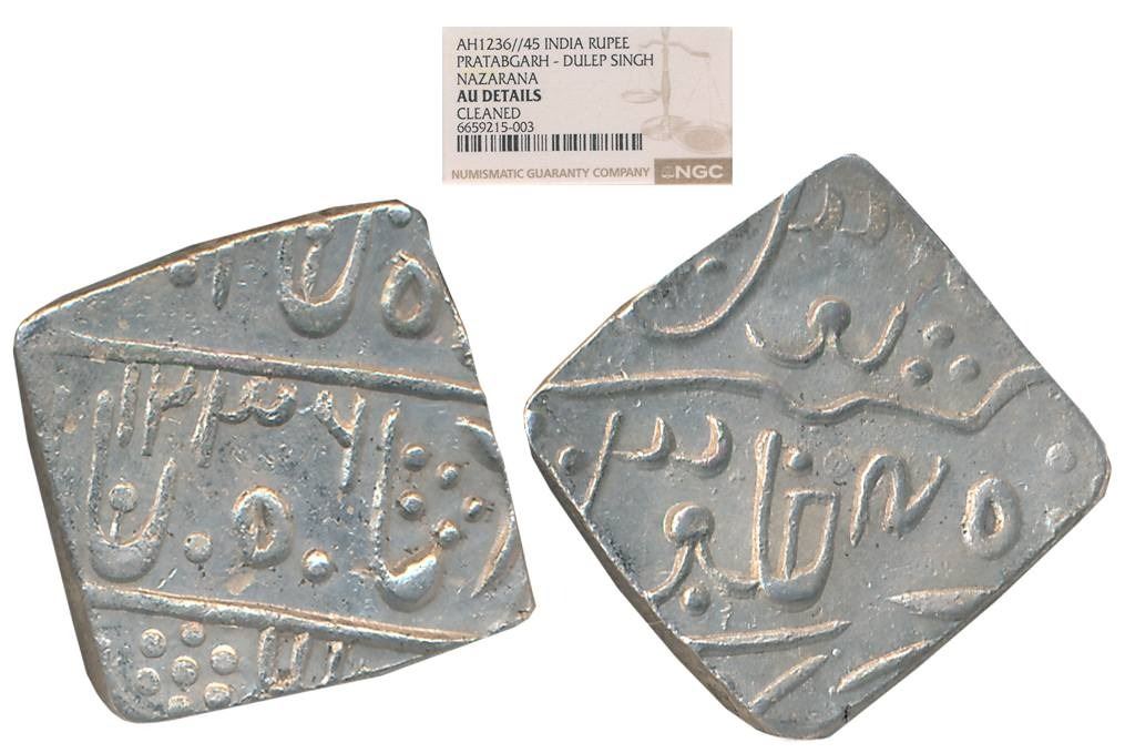 Dulep Singh, Silver Square Nazarana Rupee, Deogarh Mint, in the name of Shah Alam II, AH 1236/ RY 45 (KM# 25). Slab & Graded by NGC as AU Details.
