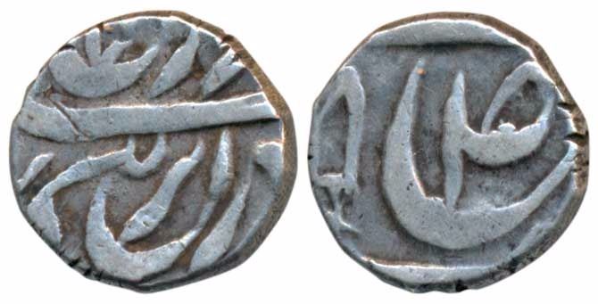 Narindar Singh (VS 1902-1919, 1845-1862 AD), Silver ¼ Rupee, 2.75g, in the name of Ahmed Shah Durrani, a broad blade sword as mint mark (KM YB1). Very Fine+, Very Rare.