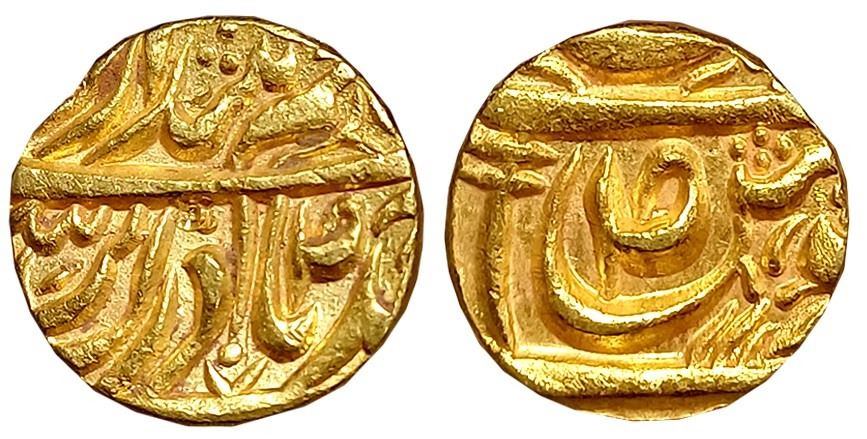 Karam Singh, Gold Mohur, 10.60g, Sahrind Mint, in the name of Ahmad Shah Durrani, Sword as Mint mark on left, Persian letter “Suaad” in seen of Julus. About uncirculated, very rare in this grade.