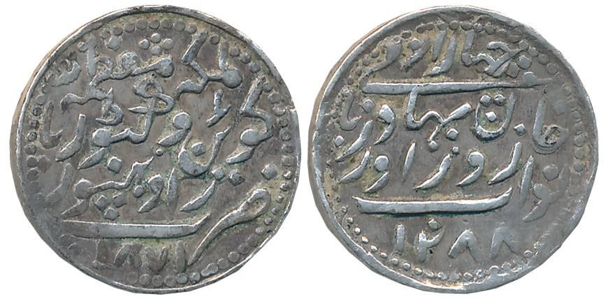Zorawar Khan, Silver 1/4 Rupee- 4 Anna, 2.90g, AH 1288/ AD 1871, with the name of Victoria Queen (KM# 9). Very fine, rare.