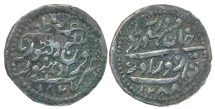 Zorawar Khan, Silver 1/8 Rupee- 2 Anna, 1.31g, AH 1288/ AD 1871, with the name of Victoria Queen (KM# 8). Very fine, very rare.