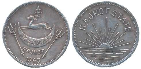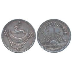 Dharmendra Singhji, Silver Mohur- original strike, 5.86g, 1945, Obv: Legend “Rajkot State” above rising Sun, Rev: State monogram date below. Very fine, rare.