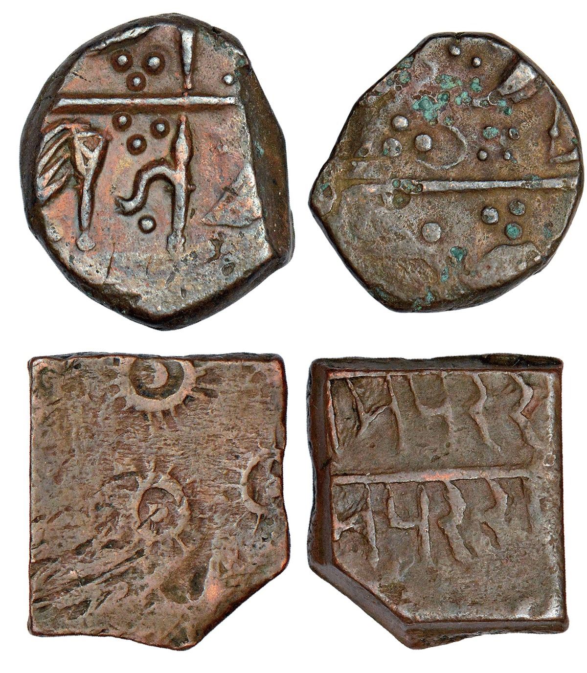 Princely States: Rampur (Sunth Rampur), copper paisa (2), 1x 8.51g, Obv: Fly whisk and elephant goad. Rev: Inscription and 1x 7.78g, Obv: Three sun with rays. Rev: Devanagari legend Rampur twice in two lines. (2 coins)