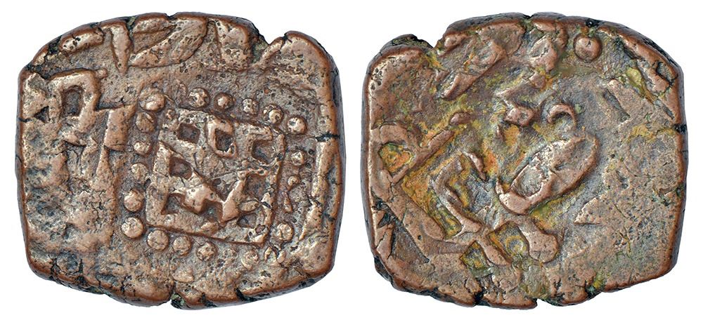 Ratlam, square copper paisa, in the name of Shah Alam II, unlisted in KM, 12.31g. Obv: Geometrical design box within dotted square. Rev: A sword mintmark.