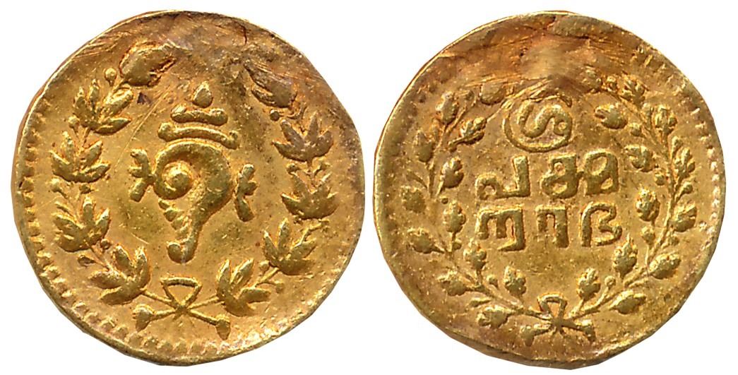 Bala Rama Varma II, Gold 1/4 Pagoda, 0.61g, ND, "Tulabharam" coin, Obv: Tamil legend in 3 lines, Rev: Shankha (conch) within sprays, (KM# X# 9). Removed from loop otherwise very fine, very rare.