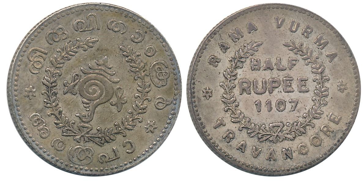 Rama Varma VI, Silver 1/2 Rupee, 5.30g, ME 1107, Obv: Conch shell, wreath around, Malayali legend, Rev: English legend Bala Rama Varma, date, denomination (KM# 53). Very fine+.