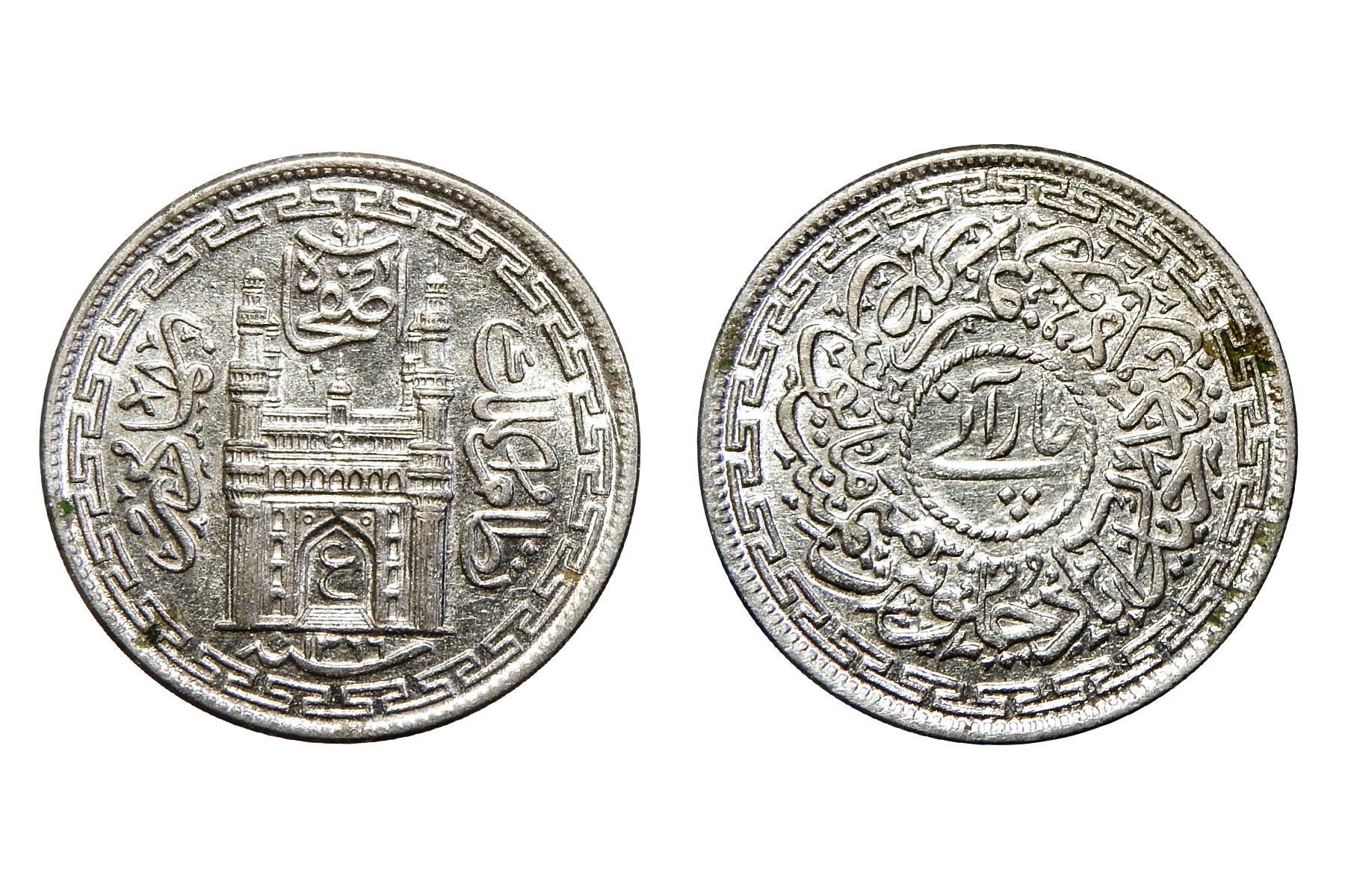 Hyderabad State, Mir Usman Ali Khan (1911 to 1948 AD / 1329 to 1367 AH), Silver 1/4 Rupee, 2.80 grms,