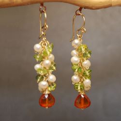 Metal: GoldClusters of pearls, peridot, and mandarin garnet, about 2" long Available in either 14K gold-filled, rose gold-filled, or sterling silver. All jewelry is entirely handmade in our studio in New York.