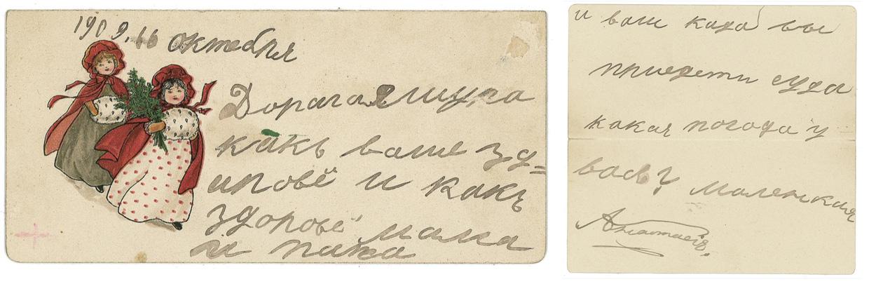 Youngest daughter of Czar Nicholas II of Russia, Anastasia was murdered with her family on 17 July 1918, by forces of the Bolshevik secret police. Autograph note signed in Russian, ''Anastasia,'' on the front and inside of a 5.25'' x 2.5'' fold-open card bearing a color chromolithograph of two little girls in winter clothes and sable muffs, one of which carries a Christmas tree. Lovely little note from the eight-year old princess to her ''Shura'' dated 16 October 1909. In part (translated) ''...How are you, how is your health?...'' Some scattered light toning and soiling, primarily to first page and a bit of trivial surface loss to top right corner, otherwise fine condition. During this period, Anastasia was undoubtedly under the medical care of Rasputin, the Russian mystic who treated her brother, Alexei, and who developed friendships with the Imperial children. A brief but tender note from the young royal.
