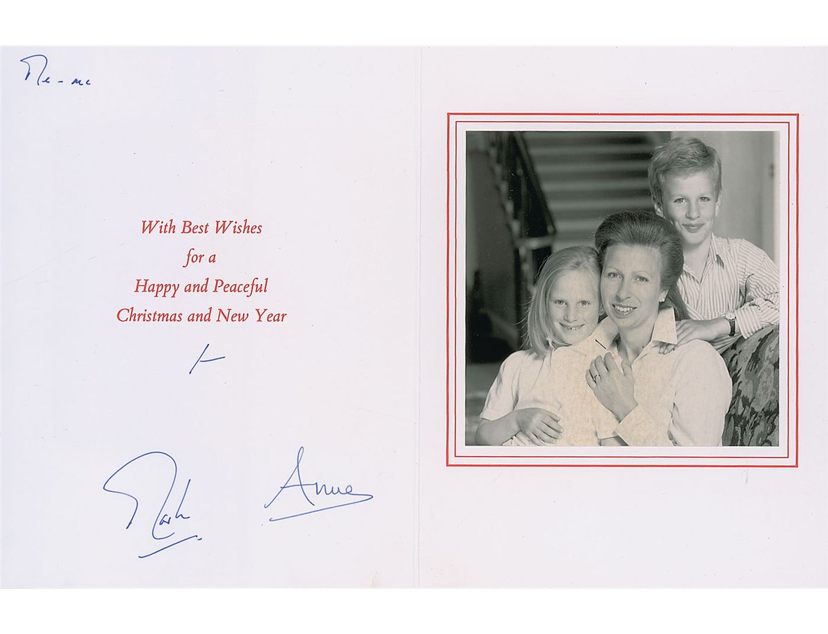 Pair of Christmas cards from both of Princess Anne’s marriages, featuring her initials embossed in red on the front. The first, circa 1980s, features a photo of Anne and her two children affixed inside, and is signed below a printed Christmas greeting by the princess, “Anne,” and her husband Mark Phillips, “Mark.” The second is from 1995, and features an affixed color photo of Anne and her new husband, Timothy Laurence, with their family, signed, “To you both, from Tim and Anne,” with everything in Anne’s hand except “from Tim.” In fine condition. Accompanied by the original mailing envelope for the 1995 card.
