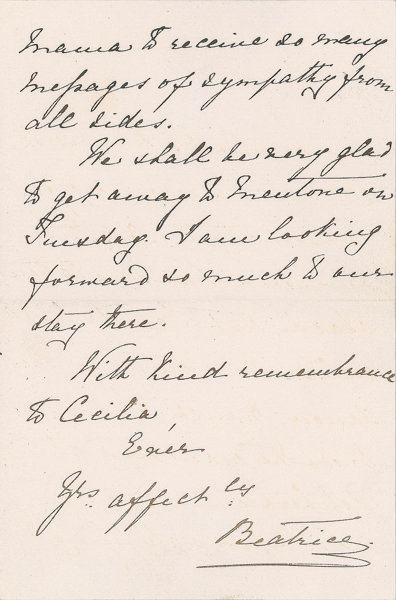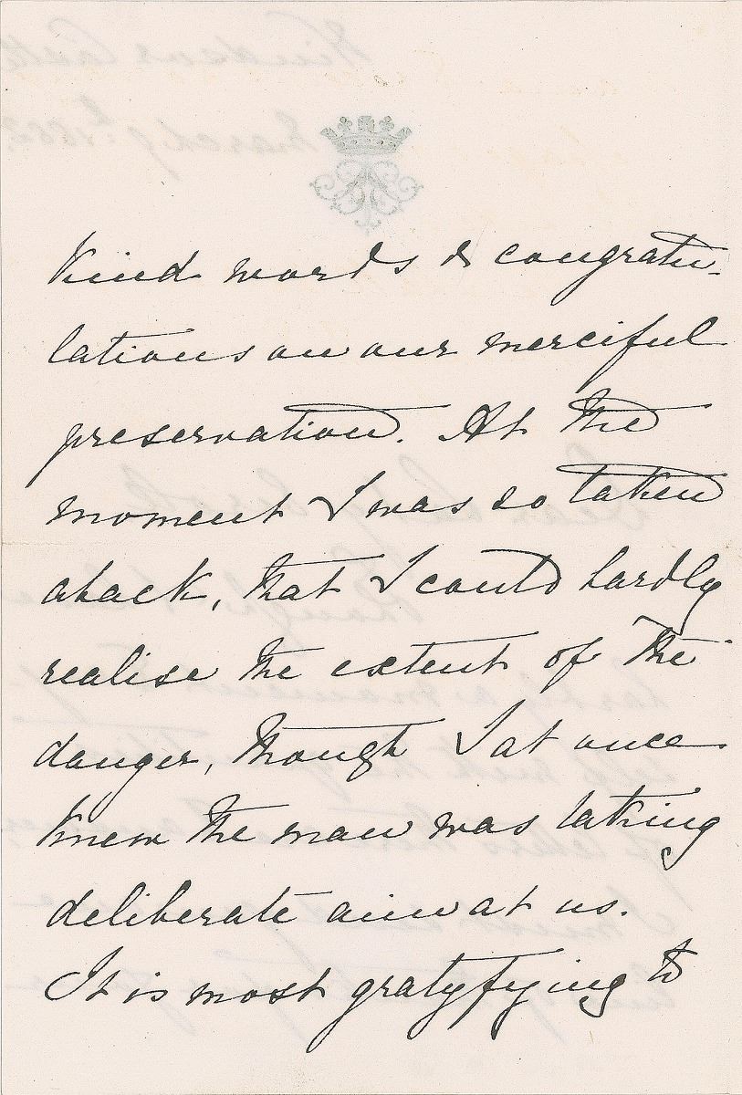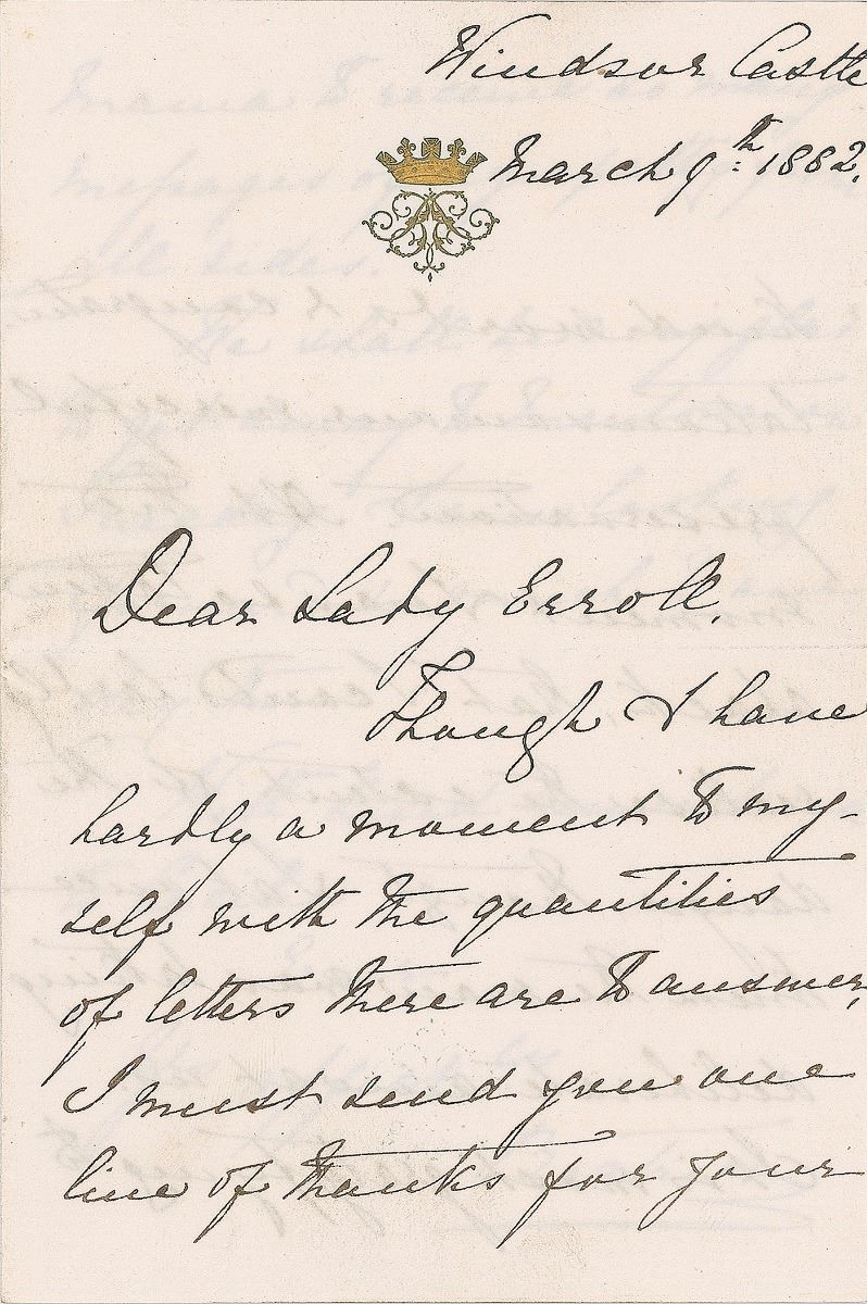 The fifth daughter and youngest child of Queen Victoria and Prince Albert. ALS signed “Beatrice,” three pages on two adjoining sheets, 4 x 6, personal letterhead, March 9, 1882. Written from Windsor Castle, a letter to Lady Erroll, in full: “Though I have hardly a moment to myself with the quantities of letters there are to answer, I must send you one line of thanks for your kind words & congratulations on our merciful preservation. At the moment I was so taken aback, that I could hardly realize the extent of the danger, though I at once knew the man was taking deliberate aim at us. It is most gratifying to Mama to receive so many messages of sympathy from all sides. We shall be very glad to get away to Mentone on Tuesday. I am looking forward so much to our stay there. With kind remembrance to Cecilia.” In fine condition. Roderick McLean attempted to assassinate Queen Victoria on March 2, 1882, at Windsor, England.