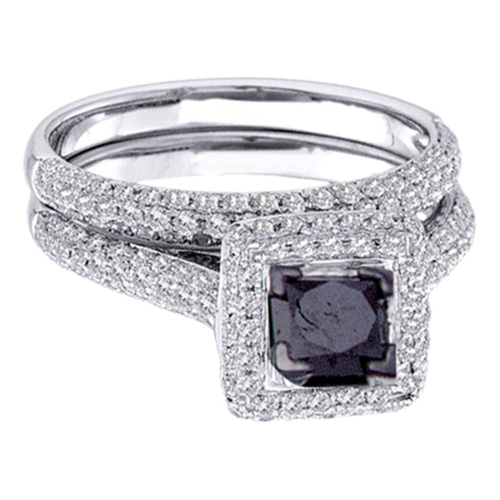 Princess Black Color Enhanced Diamond Wedding Ring Set 1-1/4 Cttw Sz 8 14kt White Gold