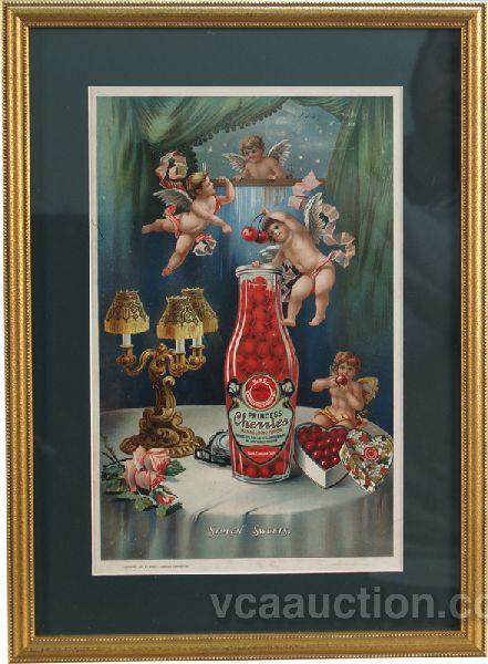 Princess Cherries "Stolen Sweets" c1907 Paper Advertisement w/ cherubs stealing cherries, in frame, in good condition - 11" x 15"