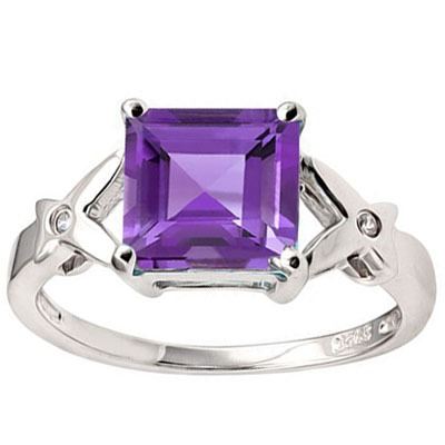 2-3/5 Carat princess cut genuine Amethyst gemstone is set in platinum over sterling silver ring mounting with lab created white sapphire gemstone accents. Size 7. 2.3g