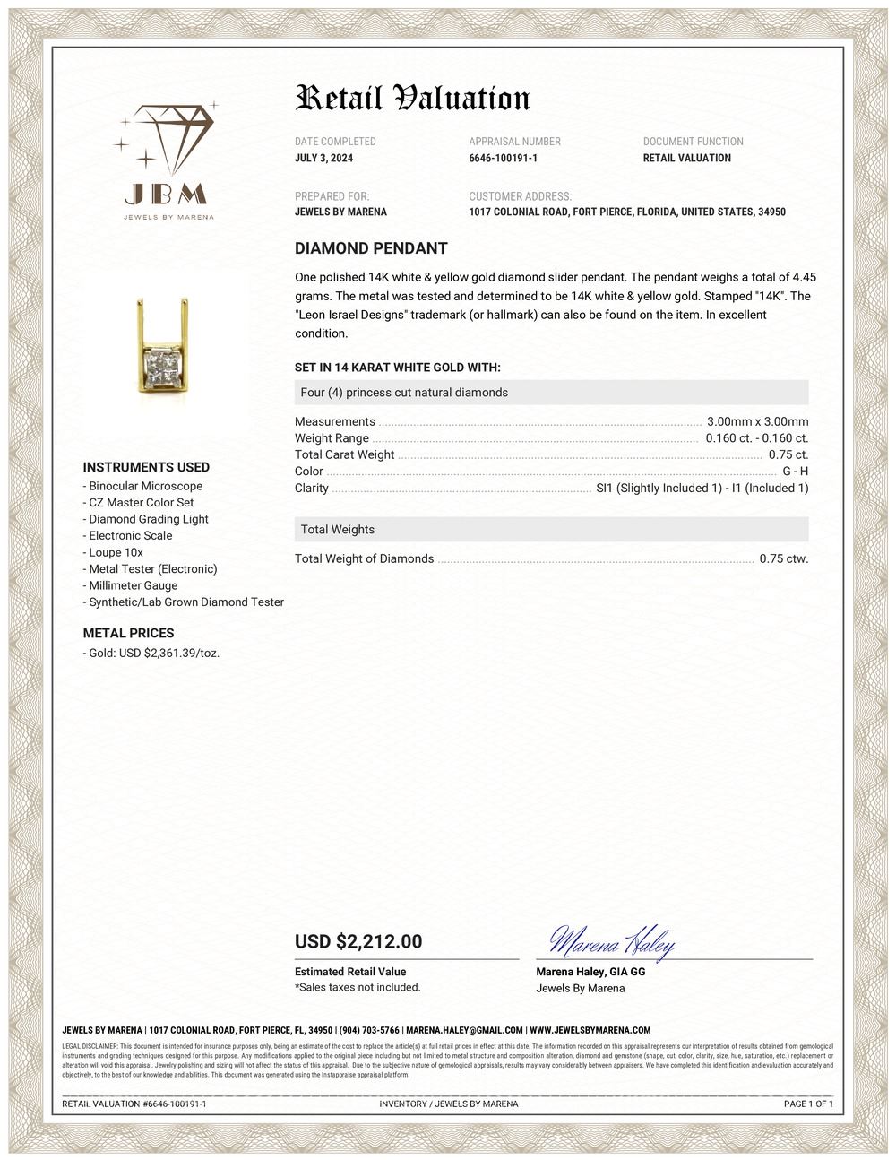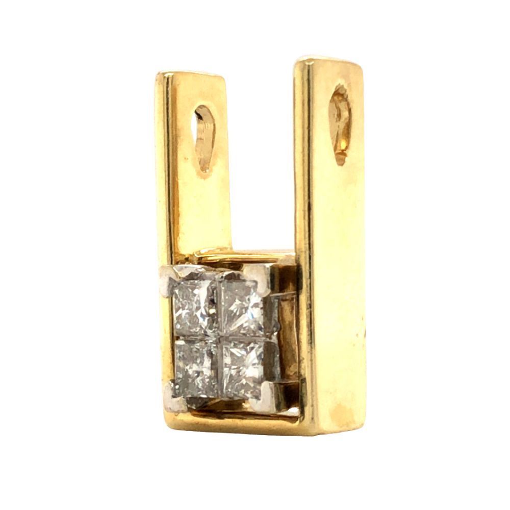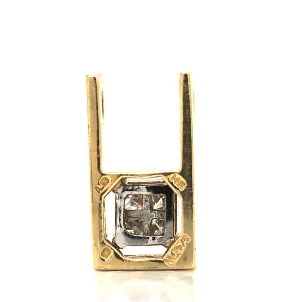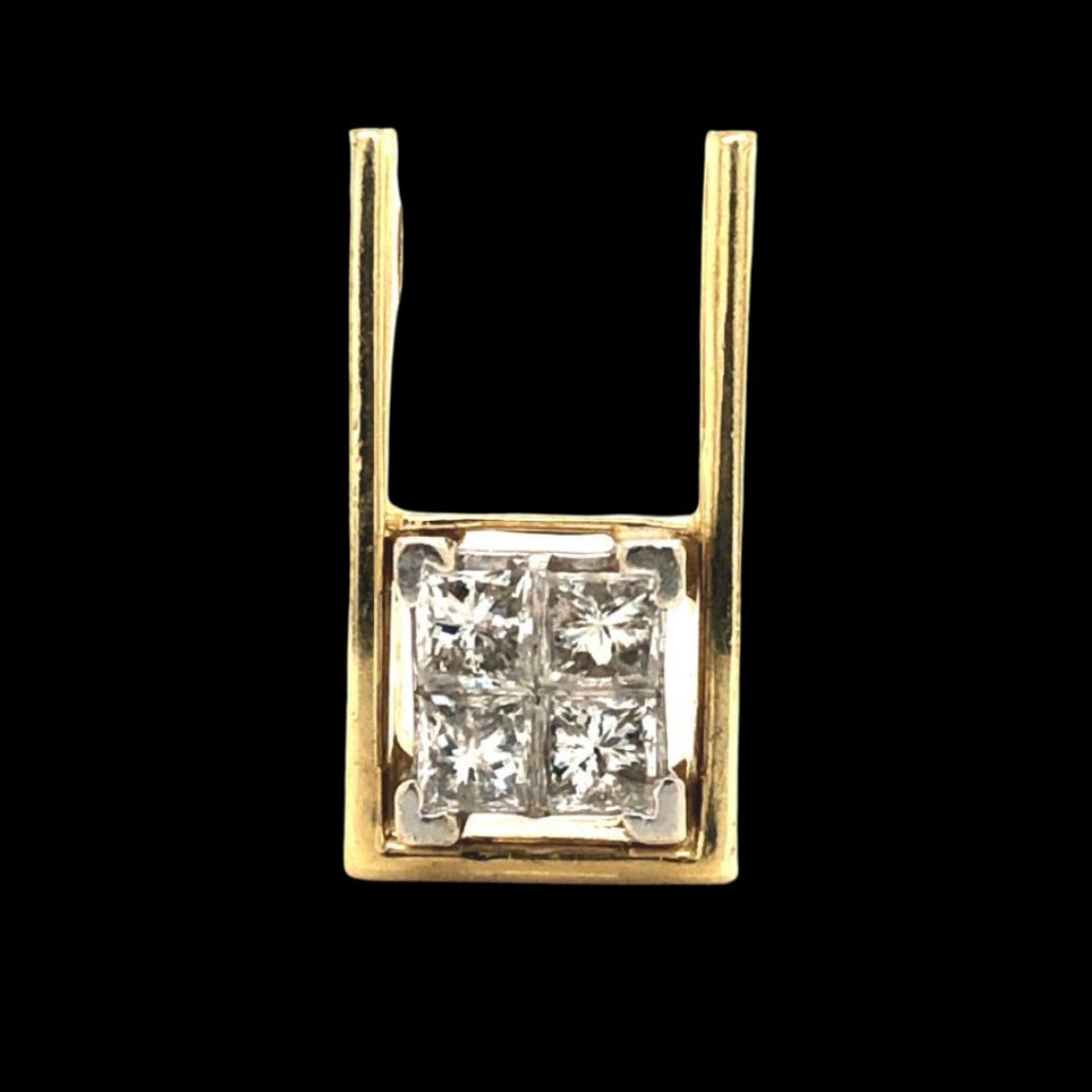 S8/2.9 - LSS TITLE DESCRIPTION: Princess Cut Diamond Slide Pendant DESCRIPTION DETAIL: A beautiful pendant featuring natural Princess Cut Diamonds set in 14K Yellow Gold. OVERALL CONDITION: Good Estate Condition DIAMONDS: Natural (4) Weight: ~0.75 Carats Total Weight Shape: Princess-Cut Color: H Clarity: SI METAL: 14K Yellow Gold WEIGHT: 4.4 Grams SIZE: H3/4" x W3/8" x D1/4" APPRAISAL REPORT: JBM certified and appraised this ring with an estimated retail replacement value of $2,212. PRIOR TO BIDDING READ THE DESCRIPTION & TERMS CAREFULLY This description and condition report is provided for your convenience based on the information provided by the consignor. CAA is not responsible for any discrepancies between this information and other opinions. Buyers Premium: 18% Shipping Billed Separately Payment Due in 5 days All items shipped to registered address - NO EXCEPTIONS S8/2.9 - LSS