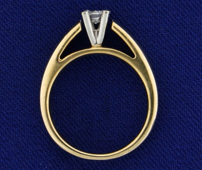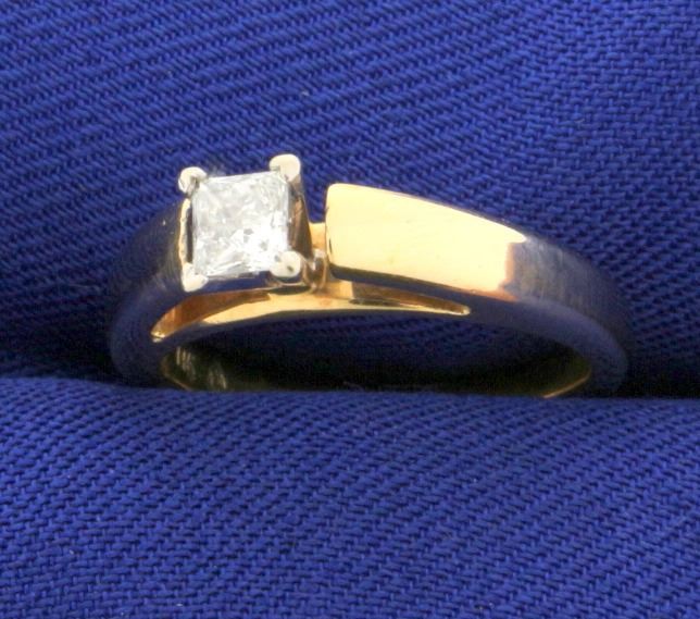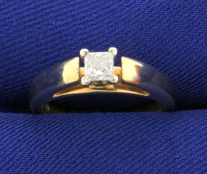 In 14k yellow and white gold. The high quality princess cut diamond is 0.25 carats (1/4 carat) with SI clarity and G color. High "shoulder" ring is a great style. Size 5. 4.6g