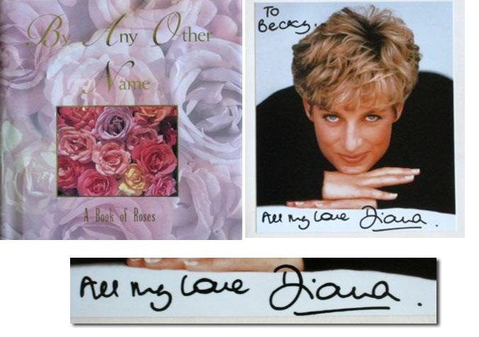 Lovely Princess Diana signed photo of herself, inscribed, ''To Becky, All my love. Diana''. Color photo is affixed to the front free endpaper of the book ''By Any Other Name - A Book of Roses'' which Diana gave to Becky as gift, along with an ornamental metal bookmark, all included here. Book measures 6'' x 6'' with minor creasing to dustjacket. Near fine condition.