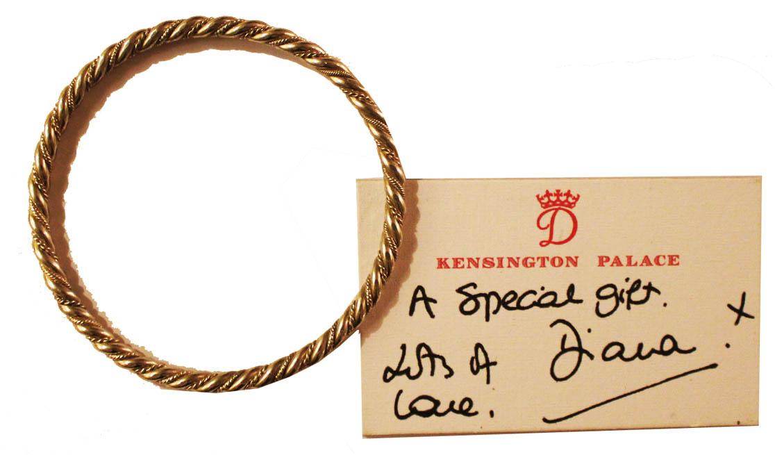 Princess Diana-owned bracelet patterned in heavy, coiling sterling silver, with original gift box and red ribbon. The silver bangle was worn by Diana on many occasions and given to a hospitalized young lady whom the Princess befriended. Provenance includes Kensington Palace placard with handwritten note and underlined signature that reads ''A special gift. Lots of Love, ''Diana. x''. Bracelet, in near fine condition, measures 3.25'' in diameter. Box measures 3.5'' x 3.5'' and signed placard 3.5'' x 2''.