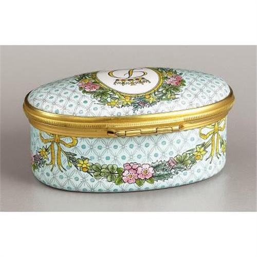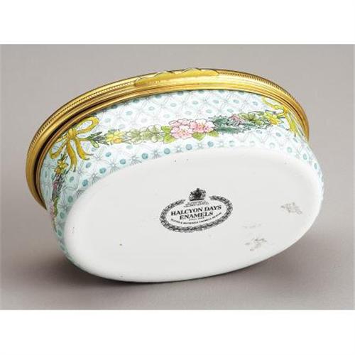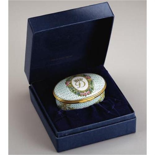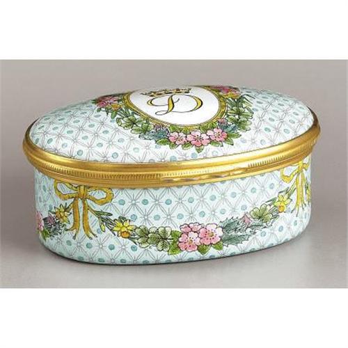 <B>Princess Diana Halcyon Days Porcelain Presentation Box</B></I><BR><BR>Oval, overall decorated with pale green lattice design, the sides enhanced with floral enameled garlands, the cover with a central floral wreath enclosing the crowned initial <I>D </B></I>for Diana, Princess of Wales (1961-1997), on white ground with white interior, the base with maker's stamp<I>- </B></I>2 3/4 in. wide <BR><BR>Provenance: <BR>Commissioned by Princess Diana as a presentation gift to high-ranking visiting dignitaries or important guests or hosts<BR>Purchased from Hope & Glory, London<BR><BR><BR><b>Shipping:</b> Requires 3rd Party Shipping (<a target="_blank" href="http://www.heritageauctions.com/common/shipping.php">view shipping information</a>)