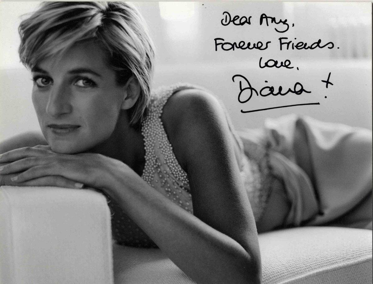 Beautiful and dramatic Princess Diana photo signed, ''Dear Amy, Forever Friends. Love, Diana. x'' in large handwriting beside the image of herself laying casually on a sofa. Black and white matte photo is mounted on thick board with a bright blue backing. Circa 1996. Exquisite 10.5'' x 8'' photo is in fine condition.