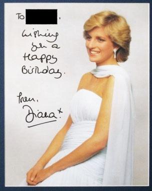 Large and stunning 8'' x 10'' glossy color photo of Lady Di seated in an elegant white gown. Inscription in black marker reads: ''To Cathy, Wishing you a Happy Birthday. From, Diana x''. With a bold, clear signature. In royal blue matting measuring 10.75'' x 13.75''. Near fine condition.