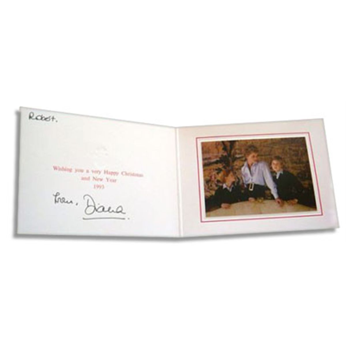 Lovely Princess Diana 1993 Christmas card signed. Card is addressed by Lady Di to a Robert and reads: ''Wishing you a Happy Christmas and New Year / 1993'' and is signed boldly ''From, Diana'' in black marker. Card features Diana with her two sons, Princes William and Harry. Card measures 8'' x 6'' and is in fine condition.