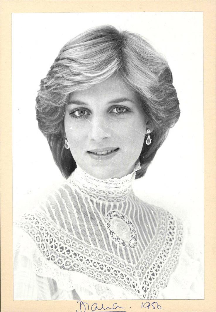 Princess Diana signed photograph. Black and white photo signed, “Diana / 1986,” in bold blue ink. Text to mat reads, “Her Royal Highness / The Princess of Wales / President of Dr. Barnardo's.” Image measures approximately 8.75'' x 12.5''; 11.75'' x 16.5'' with mat. Creasing and wear to top right corner of mat. Overall scratching and surface wear to image, else good condition.