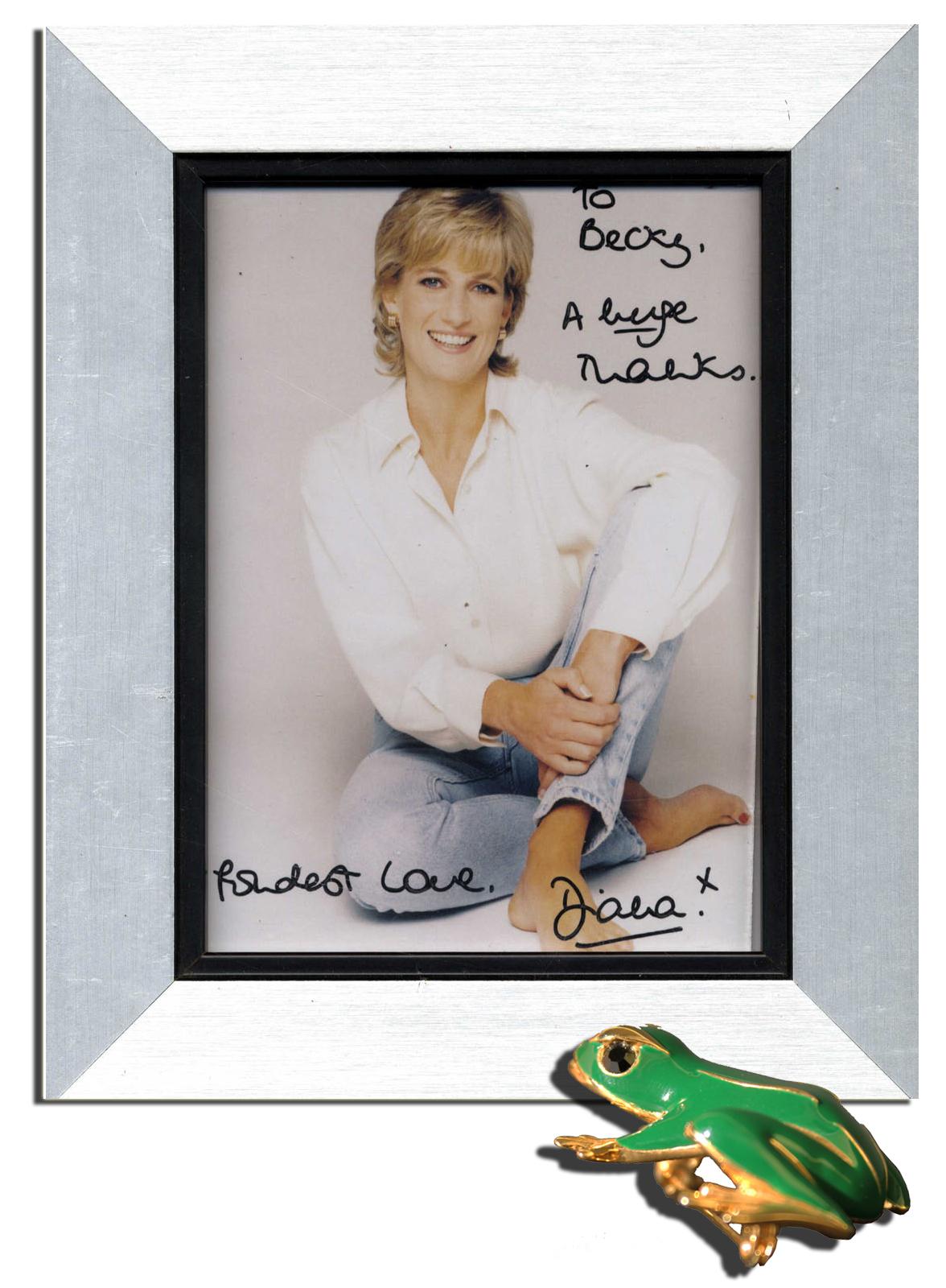Vibrant glossy color photo of Lady Di posing seated in jeans and a casual blouse. Inscription in black marker reads: ''To Becky, A huge Thanks. Fondest Love. Diana. x''. With a bold, clear signature. Also includes a green and gold 2'' x 1.5'' enamel brooch of a frog, given as a gift by the Princess. Photo, measuring 5.5'' x 7.5'' has minor wear to edges and silver frame, measuring 8.75'' x 11'', has a few minor dents, else near fine condition. Brooch is in fine condition.