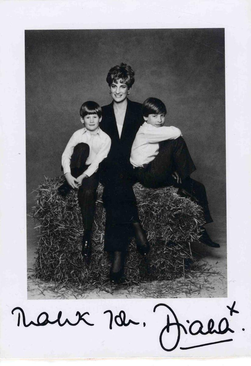 Signed photo of Princess Diana with her two sons, Prince William and Prince Henry. Dramatic black and white image reads ''Thank you, Diana'' in lower margin in black pen. Photo affixed to cardstock. Image measures 5'' x 7.25''. Fine condition.
