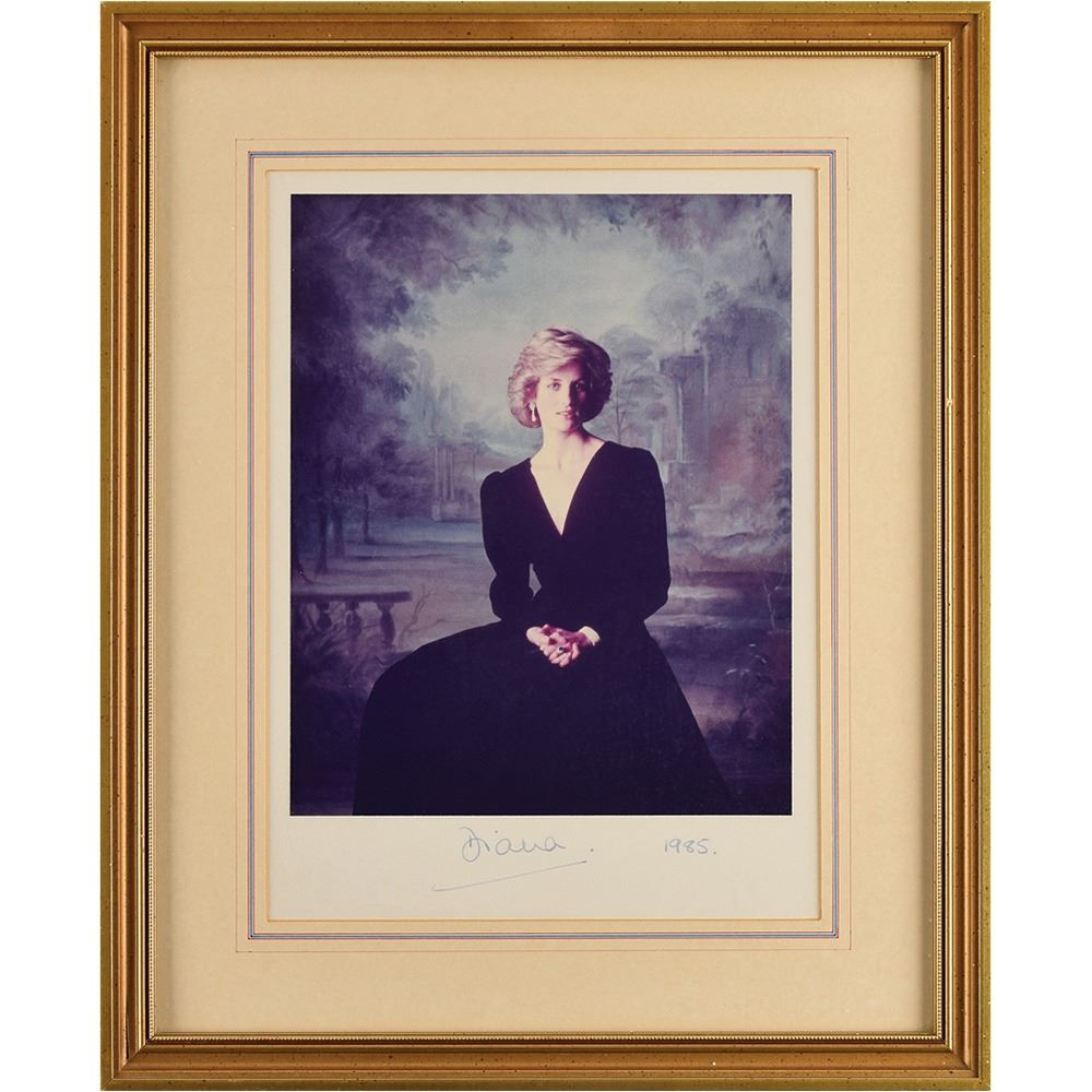 Gorgeous color satin-finish 8 x 9.75 photo of Princess Diana wearing a black velvet dress and posing against an artistic backdrop, an image originally taken by Lord Snowdon in 1985, signed neatly on the original mat in fountain pen, "Diana, 1985." Attractively matted and framed to an overall size of 14 x 17. Included with the photo is the original metal 5.25˝ Parker fountain pen used by Diana to sign the photograph, which is accompanied by a glossy 5.25 x 4 photo of Diana at the time of signing. In fine condition.
