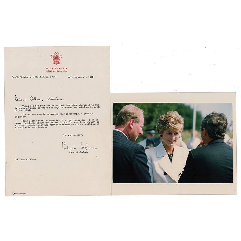 Attractive color semi-glossy 6 x 9 photo of Princess Diana smiling at an outdoor event in Manchester, England, on July 7, 1992, affixed to the original 9.5 x 14 mount, which is signed in fountain pen, "Diana, 1992." In very good to fine condition, with a light crease across the center of the image, and faint toning to the mount from prior display. Accompanied by the original mailing envelope postmarked at Buckingham Palace, an unsigned photo of Diana at the same event, and the original transmittal letter from her private secretary Patrick Jephson, dated September 28, 1992.