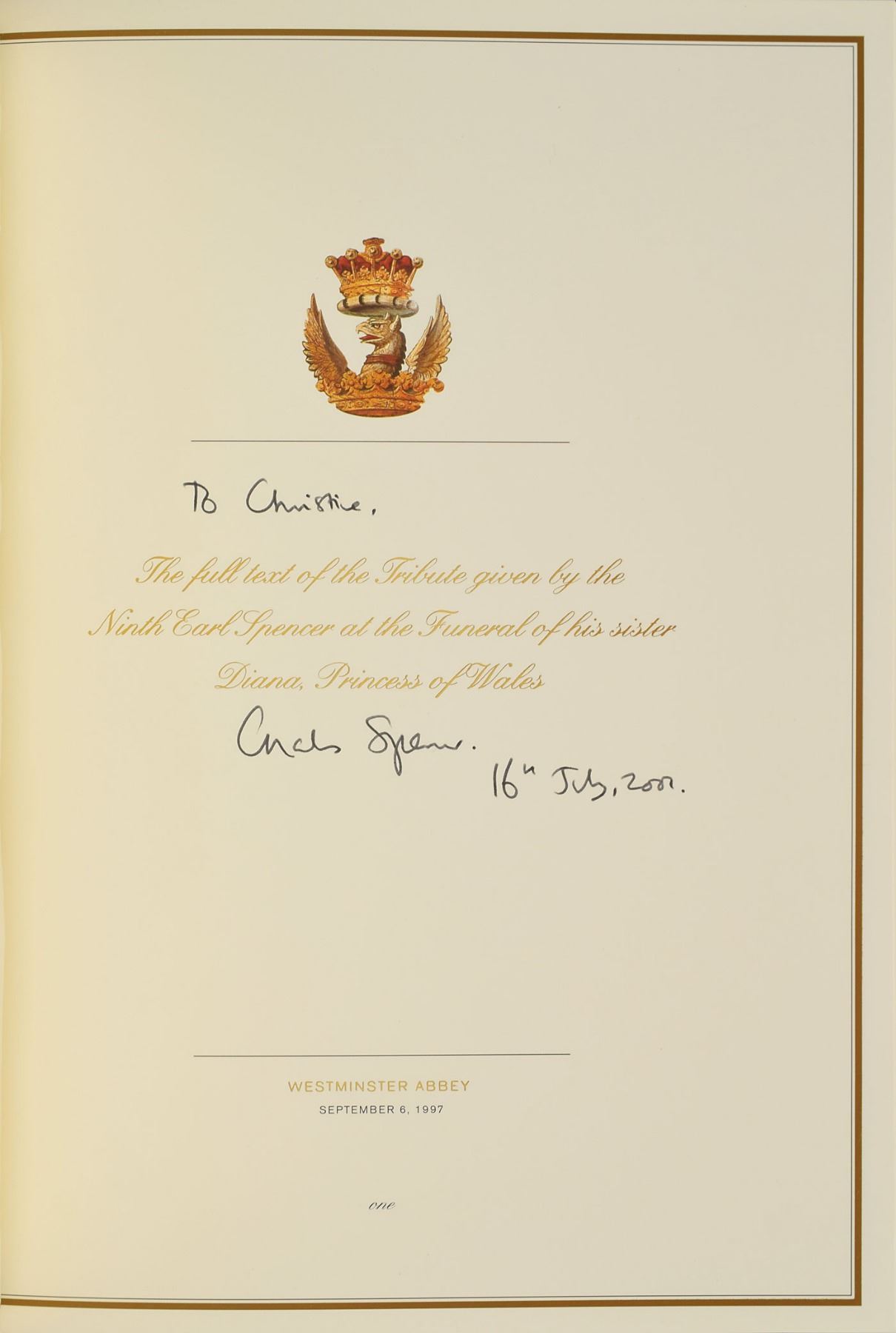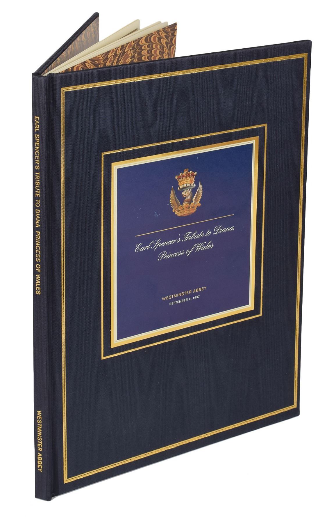 Signed book: Earl Spencer's Tribute to Diana Princess of Wales. England: Althorp, 1997. Silk-bound hardcover, 8 x 10.75, 25 pages. Signed and inscribed on an introductory page in ink, "To Christine, Charles Spencer, 16th July, 2001." Includes the original Althorp presentation box. In fine condition, with some light scuffs to box.