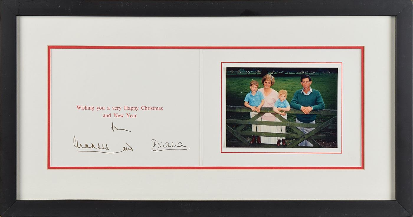 Royal Christmas card measuring 15.25 x 5.75 open, featuring a splendid color satin-finish 5.5 x 4 photo of Diana and Charles posing with their young sons, Prince Harry and Prince William, signed in fountain pen, "from, Charles and," and in black ink, "Diana." Double-matted and framed to an overall size of 20.25 x 10.75. In fine condition.