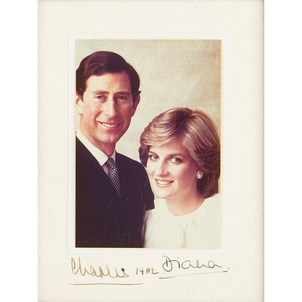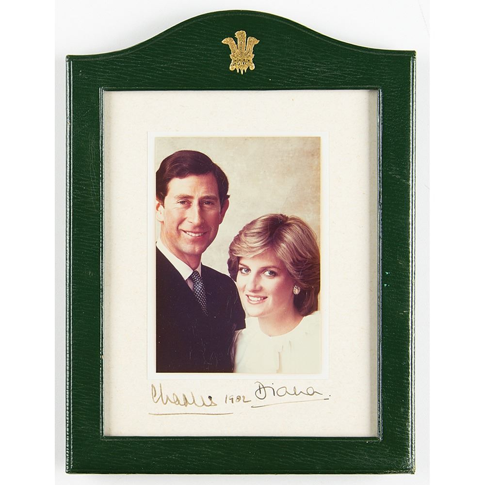 Appealing color satin-finish 3.25 x 4.75 portrait photo of the Royal couple, affixed to its original mount, signed on the mount in fountain pen, "Charles 1982" and "Diana." Displayed in its original green leather Jarrolds of Knightsbridge frame to an overall size of 7 x 9.25. In very fine condition. A year earlier, the fabled royal wedding of Charles and Diana took place at St. Paul’s Cathedral on July 29, 1981, before an invited congregation of 3,500 and an estimated worldwide television audience of 750 million.