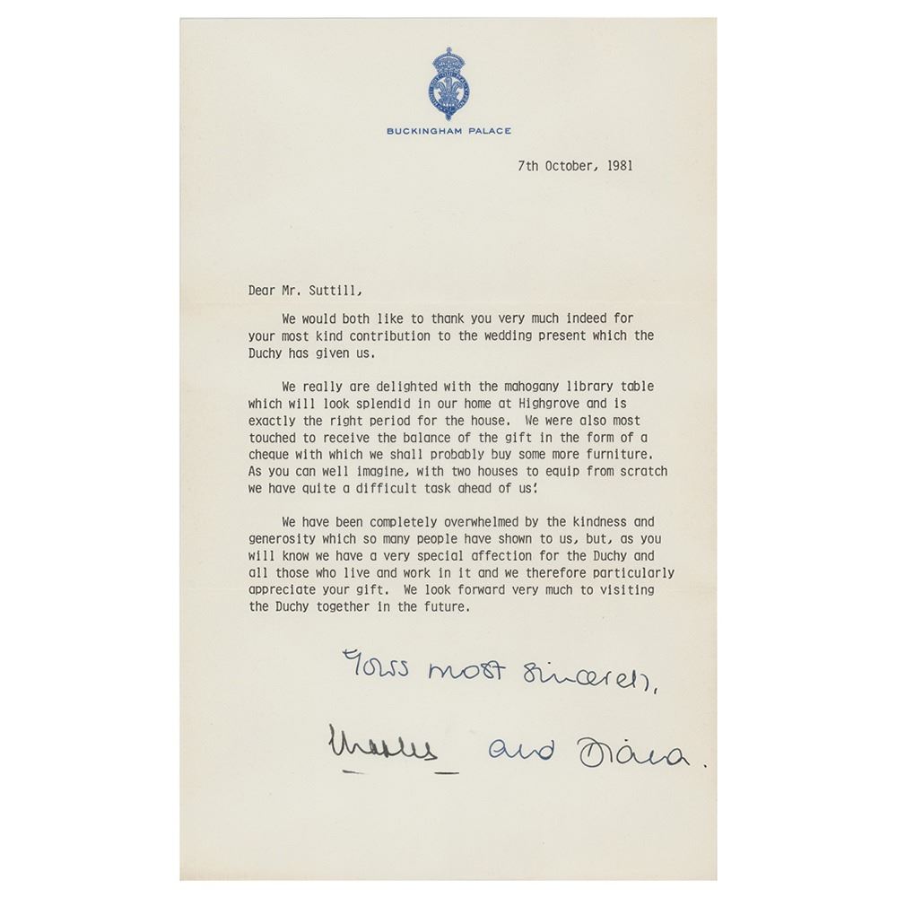 TLS signed ‰ÛÏCharles" and "Yours most sincerely, and Diana,‰Û one page, 8 x 13, Buckingham Palace letterhead, October 7, 1981. Letter to W. A. Suttill, in full: "We would both like to thank you very much indeed for your most kind contribution to the wedding present which the Duchy has given us. We really are delighted with the mahogany library table which will look splendid in our home at Highgrove and is exactly the right period for the house. We were also most touched to receive the balance of the gift in the form of a cheque with which we shall probably buy some more furniture. As you can well imagine, with two houses to equip from scratch we have quite a difficult task ahead of us! We have been completely overwhelmed by the kindness and generosity which so many people have shown to us, but as you will know we have a very special affection for the Duchy and all those who live and work in it and we therefore particularly appreciate your gift. We look forward very much to visiting the Duchy together in the future." In fine condition. Accompanied by the original mailing envelope. The fabled royal wedding took place at St. Paul‰Ûªs Cathedral on July 29, 1981, before an invited congregation of 3,500 and an estimated worldwide television audience of 750 million.