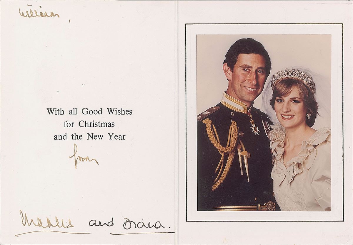 Christmas card embossed with the Prince of Wales’s feathers and Order of the Garter motto and the Spencer family arms, measuring 10.5 x 7.25 open, featuring an affixed color photo of the newly wedded royal couple, signed and inscribed in fountain pen, “William, from Charles" and "and Diana.” The interior of the card is in fine condition; the exterior has old tape residue along the edges from prior, opened display. Pre-certified PSA/DNA.