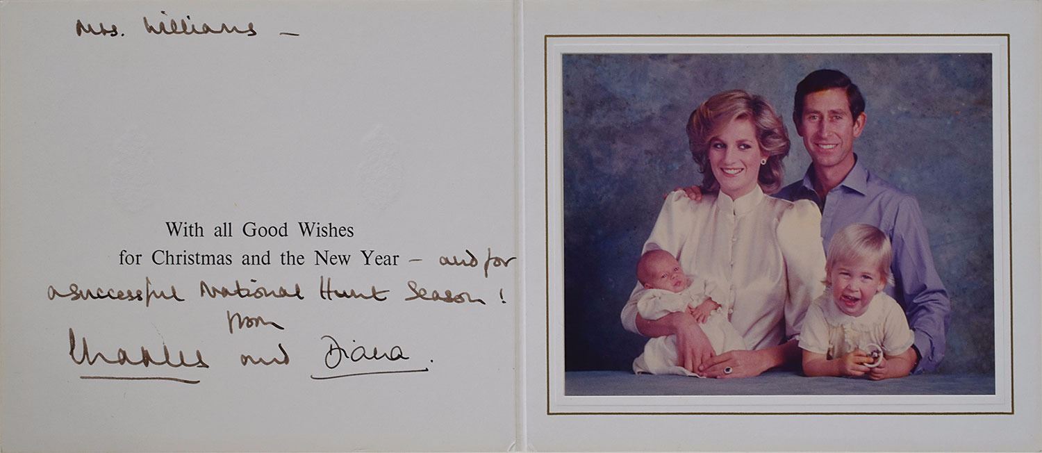 Christmas card measuring 14 x 6 open, featuring an affixed color photo of Diana and Charles posing with their young sons, Prince Harry and Prince William, signed and inscribed above a preprinted sentiment in fountain pen, “Mrs. Williams—…—and for a successful national hunt season! from Charles and" and "Diana.” In fine condition, with old mounting remnants on the back of the card.