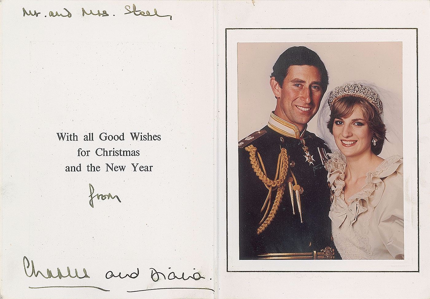 Christmas card embossed with the Prince of Wales’s feathers and Order of the Garter motto and the Spencer family arms, measuring 10.5 x 7.25 open, featuring an affixed color photo of the newly wedded royal couple, signed and inscribed in fountain pen, “Mr. and Mrs. Steel, from Charles," and in black ink, "and Diana.” In fine condition, with soiling to the outside covers and a slight smudge to Diana's signature.