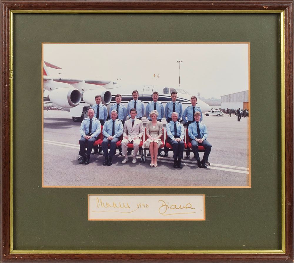 Exceptional ink signatures, "Charles 1990" and "Diana," on an off-white slip removed from the lower portion of a photographic mount. Matted and framed with the original photo from which the signature was removed to an overall size of 13.75 x 12.25. The color photo shows Charles and Diana posing with members of the Royal Air Force; the consignor notes that that signed photos of this exact image were presented as exclusive appreciatory gifts to each pictured Air Force member, thus making any such example remarkably uncommon and highly sought-after. In fine condition, with light fading to the signatures and the frame's backing loose.