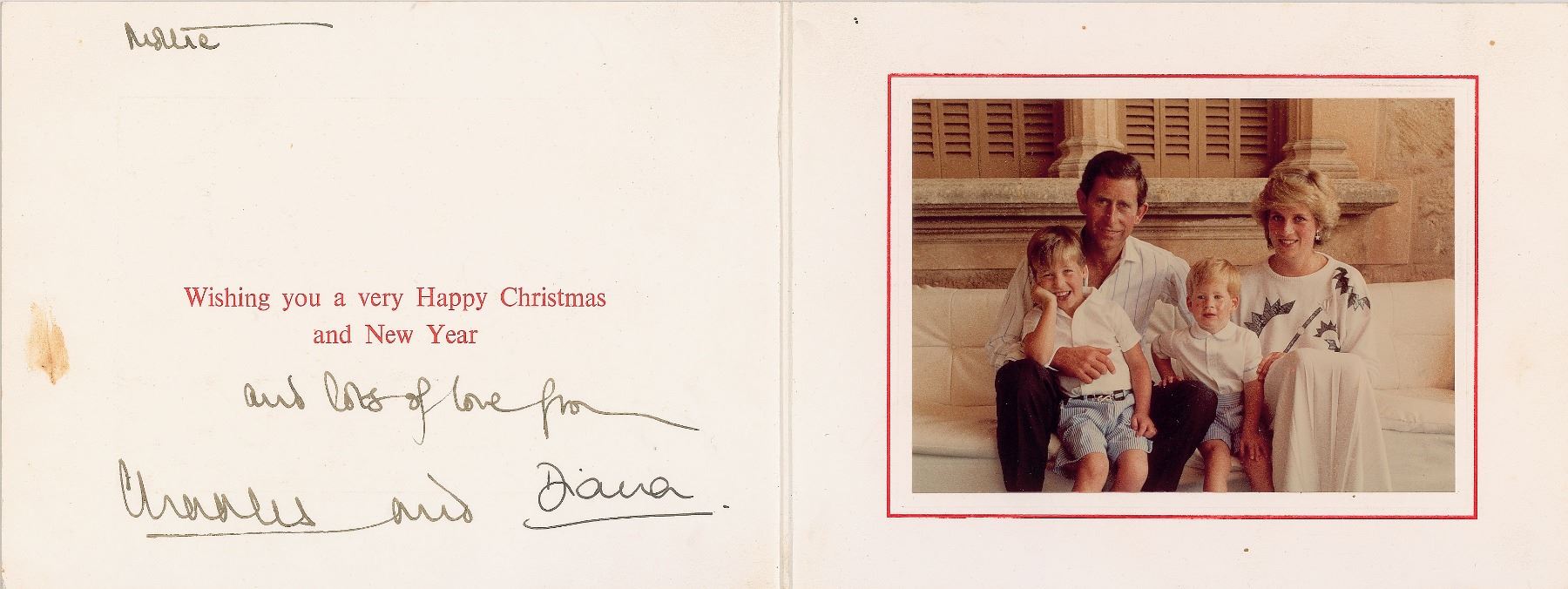 Christmas card from 1987 embossed with the Prince of Wales’s feathers and Order of the Garter motto and the Spencer family arms, measuring 16 x 6 open, featuring an affixed color photo of the couple with their two young sons, Prince Harry and Prince William, signed and inscribed on the adjacent page in fountain pen, "Mollie…and lots of love from Charles and" and "Diana." In very good to fine condition, with a few stains, the heaviest on the signed panel, and some old adhesive residue on the back of the card.