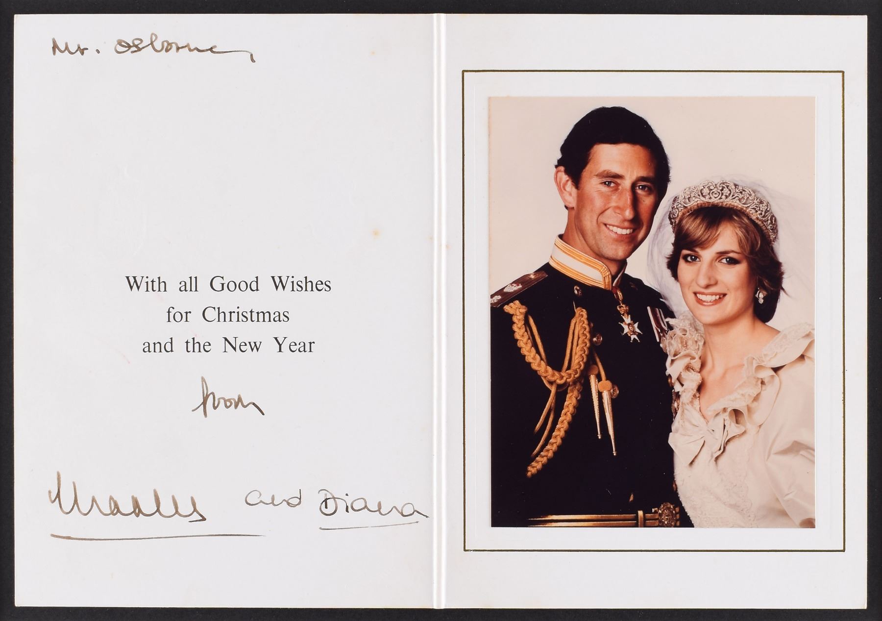 Royal Christmas card from circa 1981, measuring 10.5 x 7.25 open, featuring an affixed color photo of the newly wedded royal couple, signed and inscribed in fountain pen, “Mr. Osborne, from Charles," and, "and Diana." Mounted and matted to an overall size of 15 x 11.75. In fine condition, with a few trivial spots off foxing.