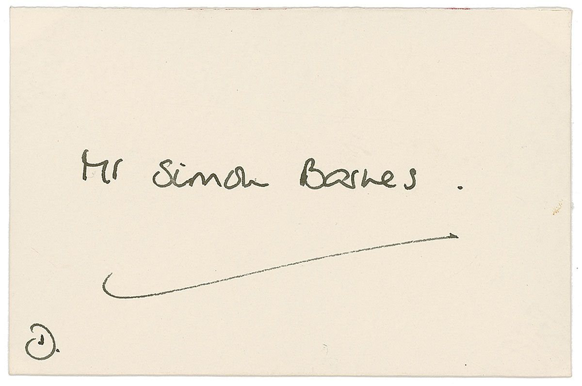 ALS signed “Diana,” both sides of her 6 x 4 red-bordered personal Kensington Palace correspondence card, June 27, 1995. Diana writes to Simon Barnes. In full: “I got a lovely surprise when Jean gave me your present of The Tibetan Book of Living & Dying—a title just up my street & I have no doubt that the contents will be fascinating. You are so kind to have thought of me on the birthday, thank you. With love from, Diana.” Accompanied by the original transmittal envelope bearing Barnes’s name in Diana’s hand and initialed by her at lower left, “D.” In very fine condition.